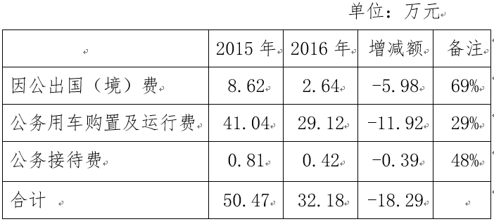 2015年“三公经费”公共预算财政拨款支出50.47万元,其中因公出国(境)费用8.62万元,公务用车购置及运行费41.04万元,公务接待费0.81万元。2016年“三公经费”公共预算财政拨款支出比2015年“三公经费”公共预算财政拨款支出减少18.29万元。减少原因为加强财务管理,贯彻落实中央“八项规定”和省委“双十条”规定,例行节约,压缩“三公经费”支出及公车改革中保留车辆减少。